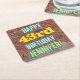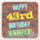This fun birthday-themed coaster design features a message like "HAPPY 43rd BIRTHDAY, JENNIFER!", where the name can be personalised. The background features a representation of a brick wall consisting of some reddish-brown coloured bricks. The customisable message text features colours like blue, yellow, and green, and it has an appearance inspired by that of painted graffiti. Coasters like these might be useful as practical decorations at a birthday party for somebody who is celebrating their forty third birthday. [~Z0000288]
