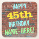 This fun birthday-themed coaster design features a message like "HAPPY 45th BIRTHDAY, NAME-HERE!", where the name can be personalised. The background features a representation of a brick wall consisting of some reddish-brown coloured bricks. The customisable message text features colours like blue, yellow, and green, and it has an appearance inspired by that of painted graffiti. Coasters like these might be useful as practical decorations at a birthday party for somebody who is celebrating their forty fifth birthday. [~Z0000288]