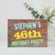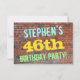 This fun birthday party invitation design features a message like "STEPHEN’S 46th BIRTHDAY PARTY!", where the name can be personalised, on the front. The background features a representation of a brick wall consisting of some reddish-brown coloured bricks. The customisable message text on the front features colours like blue, yellow, and green, and it has an appearance inspired by that of painted graffiti. The back features a customisable message that could include relevant details about the birthday party. Birthday party invitations like this might be a fun way to invite family and friends to a birthday party being held for somebody who is celebrating their forty sixth birthday. [~Z0000287]
