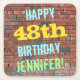 This fun birthday-themed coaster design features a message like "HAPPY 48th BIRTHDAY, JENNIFER!", where the name can be personalised. The background features a representation of a brick wall consisting of some reddish-brown coloured bricks. The customisable message text features colours like blue, yellow, and green, and it has an appearance inspired by that of painted graffiti. Coasters like these might be useful as practical decorations at a birthday party for somebody who is celebrating their forty eighth birthday. [~Z0000288]