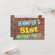 This fun birthday party invitation design features a message like "JENNIFER’S 51st BIRTHDAY PARTY!", where the name can be personalised, on the front. The background features a representation of a brick wall consisting of some reddish-brown coloured bricks. The customisable message text on the front features colours like blue, yellow, and green, and it has an appearance inspired by that of painted graffiti. The back features a customisable message that could include relevant details about the birthday party. Birthday party invitations like this might be a fun way to invite family and friends to a birthday party being held for somebody who is celebrating their fifty first birthday. [~Z0000287]