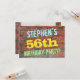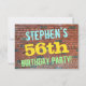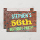 This fun birthday party invitation design features a message like "STEPHEN’S 56th BIRTHDAY PARTY!", where the name can be personalised, on the front. The background features a representation of a brick wall consisting of some reddish-brown coloured bricks. The customisable message text on the front features colours like blue, yellow, and green, and it has an appearance inspired by that of painted graffiti. The back features a customisable message that could include relevant details about the birthday party. Birthday party invitations like this might be a fun way to invite family and friends to a birthday party being held for somebody who is celebrating their fifty sixth birthday. [~Z0000287]
