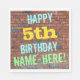 This fun birthday-themed paper napkin design features a message like "HAPPY 5th BIRTHDAY, NAME-HERE!", where the name can be personalised. The background features a representation of a brick wall consisting of some reddish-brown coloured bricks. The customisable message text features colours like blue, yellow, and green, and it has an appearance inspired by that of painted graffiti. Napkins like these could perhaps be used at a birthday party for somebody who is celebrating their fifth birthday. [~Z0000271]