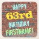 This fun birthday-themed coaster design features a message like "HAPPY 63rd BIRTHDAY, FIRSTNAME!", where the name can be personalised. The background features a representation of a brick wall consisting of some reddish-brown coloured bricks. The customisable message text features colours like blue, yellow, and green, and it has an appearance inspired by that of painted graffiti. Coasters like these might be useful as practical decorations at a birthday party for somebody who is celebrating their sixty third birthday. [~Z0000288]