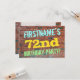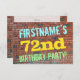This fun birthday party invitation design features a message like "FIRSTNAME’S 72nd BIRTHDAY PARTY!", where the name can be personalised, on the front. The background features a representation of a brick wall consisting of some reddish-brown coloured bricks. The customisable message text on the front features colours like blue, yellow, and green, and it has an appearance inspired by that of painted graffiti. The back features a customisable message that could include relevant details about the birthday party. Birthday party invitations like this might be a fun way to invite family and friends to a birthday party being held for somebody who is celebrating their seventy second birthday. [~Z0000287]
