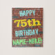 This fun birthday-themed puzzle design features a message like "HAPPY 75th BIRTHDAY, NAME-HERE!", where the name can be personalised. The background features a representation of a brick wall consisting of some reddish-brown coloured bricks. The customisable message text features colours like blue, yellow, and green, and it has an appearance inspired by that of painted graffiti. A puzzle like this might be used as a fun way to send birthday wishes to somebody who is celebrating their seventy fifth birthday, and who perhaps really likes doing puzzles. [~Z0000285]