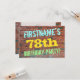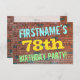 This fun birthday party invitation design features a message like "FIRSTNAME’S 78th BIRTHDAY PARTY!", where the name can be personalised, on the front. The background features a representation of a brick wall consisting of some reddish-brown coloured bricks. The customisable message text on the front features colours like blue, yellow, and green, and it has an appearance inspired by that of painted graffiti. The back features a customisable message that could include relevant details about the birthday party. Birthday party invitations like this might be a fun way to invite family and friends to a birthday party being held for somebody who is celebrating their seventy eighth birthday. [~Z0000287]