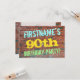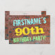 This fun birthday party invitation design features a message like "FIRSTNAME’S 90th BIRTHDAY PARTY!", where the name can be personalised, on the front. The background features a representation of a brick wall consisting of some reddish-brown coloured bricks. The customisable message text on the front features colours like blue, yellow, and green, and it has an appearance inspired by that of painted graffiti. The back features a customisable message that could include relevant details about the birthday party. Birthday party invitations like this might be a fun way to invite family and friends to a birthday party being held for somebody who is celebrating their ninetieth birthday. [~Z0000287]