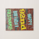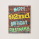 This fun birthday-themed puzzle design features a message like "HAPPY 92nd BIRTHDAY, FIRSTNAME!", where the name can be personalized. The background features a representation of a brick wall consisting of some reddish-brown colored bricks. The customizable message text features colors like blue, yellow, and green, and it has an appearance inspired by that of painted graffiti. A puzzle like this might be used as a fun way to send birthday wishes to somebody who is celebrating their ninety second birthday, and who perhaps really likes doing puzzles. [~Z0000285]