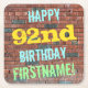 This fun birthday-themed coaster design features a message like "HAPPY 92nd BIRTHDAY, FIRSTNAME!", where the name can be personalised. The background features a representation of a brick wall consisting of some reddish-brown coloured bricks. The customisable message text features colours like blue, yellow, and green, and it has an appearance inspired by that of painted graffiti. Coasters like these might be useful as practical decorations at a birthday party for somebody who is celebrating their ninety second birthday. [~Z0000288]