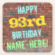 This fun birthday-themed coaster design features a message like "HAPPY 93rd BIRTHDAY, NAME-HERE!", where the name can be personalised. The background features a representation of a brick wall consisting of some reddish-brown coloured bricks. The customisable message text features colours like blue, yellow, and green, and it has an appearance inspired by that of painted graffiti. Coasters like these might be useful as practical decorations at a birthday party for somebody who is celebrating their ninety third birthday. [~Z0000288]