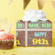 This fun birthday-themed wrapping paper design features a message like "HAPPY 9th BIRTHDAY, NAME-HERE!", where the name can be personalised. The background features a representation of a brick wall consisting of some reddish-brown coloured bricks. The customisable message text features colours like blue, yellow, and green, and it has an appearance inspired by that of painted graffiti. Wrapping paper like this could perhaps be used when wrapping birthday gifts being given to somebody who is celebrating their ninth birthday. [~Z0000274]