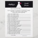 This fun bridal or wedding shower game is a perfect find for a bridal shower. Featuring a bridal gown on a black background with pink roses on the side at the top of the design, the design can be personalised for your bride with her name to the left of the bridal gown and the words "Bridal Shower" to the right of the bridal gown. This game features 20 questions for the bridal or wedding shower guests to answer about the bride. There is a spot at the bottom to add up the total score and you guessed it...the person with the most points wins the game. The design is featured on a lovely white linen paper to make a perfect addition to a bridal shower. A fun and great bridal or wedding shower game. Copyright henishouseofpaper