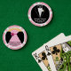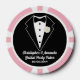 Fun bridal party poker chips with a black tie tuxedo on one side and a pink gown on the other. Personalise with the bride and groom's names for a wedding party poker game. Personalised playing cards and chips also make a fun bridal party gift.
