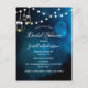 A romantic invite card for a rustic bridal shower . A dark blue evening and night with a full moon and string lights. Two rustic painted mason jars with candles. Templates for date, name, eventplace, and RSVP details. The name is written with a modern hand lettered style script. White letters.