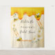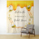 Fun summer bridal shower tapestry. Yellow, white background with a honeycomb pattern. With a faux gold geometric frame. Decorated with light yellow, cream coloured tropical florals flowers, hibiscus and happy bumble bees and sweet gold dripping honey. With the text: Bride to Bee. Personalise and add name of the bride to bee. Can be used as wall decor for the bridal shower or as a photo backdrop.