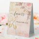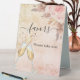 For a Bridal Shower. A rose gold and pink rustic gradient background, pink flowers and pampas grass. Bubbles and a pair of flutes. Text: Favours. Please take one!