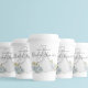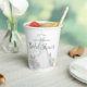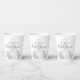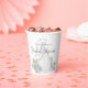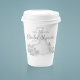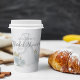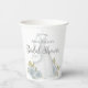 This design for a bridal shower minimalist clean simple wedding gown paper cup, with a watercolor blue elegant for her, classic editable text template, party papercup floral rose flowers, blue bride gown dress flowers, wedding dress gown clothing, a garden greenery blue wildflowers, classy calligraphy script typography, a custom customised personalised name, bridal shower party supplies