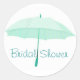 Pretty bridal shower envelope seal made using a round shape sticker, in a white background, with graphics of a aquamarine coloured umbrella and aqua coloured text reading Bridal Shower. Personalise the text to suit your party needs. Great for bridal or baby showers.