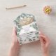 A beautiful all-in-one woodland watercolor invitation featuring a hand drawn newborn baby lying on its side sleeping in a wicker basket. The baby is surrounded by soft eucalyptus leaf strands and a scallop edged border with faux gold trim appears below the little one for your personalised wording. The bottom third has a tear off response card with personalised rsvp address for your guests to complete and the same leaves as a background. These are ideal for baby shower party celebrations for little boys and girls.