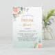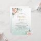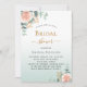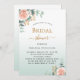 Green and white gradient background. Decorated with a rose gold and blush pink florals, rose flowers and green watercolored eucalyptus leaves, sprigs, greenery and faux gold sprigs. Personalise and add the name of the bride to be and party details. Black and golden coloured letters.