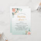 Green and white gradient background. Decorated with a rose gold and blush pink florals, rose flowers and green watercolored eucalyptus leaves, sprigs, greenery and faux gold sprigs. Personalise and add the name of the bride to be and party details. Black and golden coloured letters.