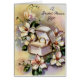 Vintage bridal shower gift card featuring a group of white flowers and nestled between is a jewellery box with an engagement ring. Lovely soft colours and style