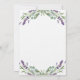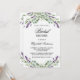 A white background. Decorated with violet lavender flowers and eucalyptus greenery. Personalise and add a name and party details. The name is written with a hand lettered style script
