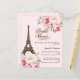 A modern, stylish and glamourous invitation for a bridal shower, parisian theme. A soft blush pink background, the Paris Eiffel tower with pink roses, flowers. The name is written with a modern hand lettered style script. Personalise and add a name and party details.