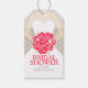 Elegant graphic light skin bride in a white wedding dress with veil holding a posy of red stylised roses wedding Bride shower tag. Reads Bridal shower honouring the customise with your brides name. Great for bridal showers, hen nights or wedding rehearsals.