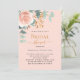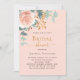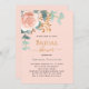A trendy peach coloured background. Decorated with a rose gold and blush pink floral, rose flower and green watercolored eucalyptus leaves, sprigs, greenery and a faux gold sprig. Personalise and add the name of the bride to be and party details. Black, green and golden coloured text.
