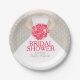 Elegant bridal dress with posy of red stylised roses floral and grey heart rain bridal shower disposable paper plate. Edit these plates with your own honouring bride to be's name. Ideal for use at a bridal shower party and matches the dress bouquet wedding stationary set. Unique design and graphic art by Sarah Trett.