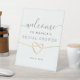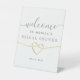 Elegant, simple white Bridal Shower Welcome pedestal sign with faux gold rope heart and modern calligraphy script.