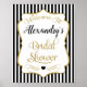 An elegant bridal shower welcome sign featuring black white stripes and gold glitter trim with customised name for the bride-to-be. A pretty gold swirl design with a heart in the centre makes this bridal shower sign a lovely way to introduce guests to your formal wedding bridal shower. More black and gold items can be found in my shop.