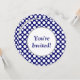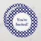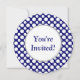 A custom birthday, bridal or baby shower invitation template with white polka-dots big and small on a dark blue background on a round invitation. Customise It to change fonts, background colours and more, even save your design for later.