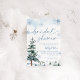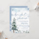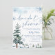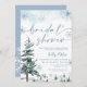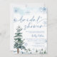 Winter wonderland bridal shower invitation. Blue invitation with pine trees and snowflakes.