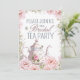 An elegant bridal shower tea party invitation with pink rose flowers and a vintage teapot on the front with a stack of vintage teacups on the back in soft shades of pink and teal. Customise with your event's name on the front and personalise the back with the bride's name, time and date of the event, location and contact details for RSVPing.