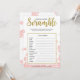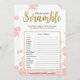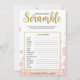 This modern floral "Bridal Word Scramble" features a pink floral background with golden glitter splashes. The text is written in a mix of a playful calligraphy font and a modern sans font, this Bridal Word Scramble card is personalized with the Bride-to-be name and the Bridal Shower date.