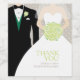 Elegant bride in white dress with a posy of green stylised roses and groom in bow tie and green waistcoat thank you wine labels. Edit these labels with your own bride and grooms name. Ideal to use on wine or beer gifting thank yous and wedding favours. Unique design and graphic art by Sarah Trett. © Art and design by Sarah Trett. www.sarahtrett.com for www.mylittleeden.com