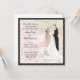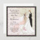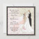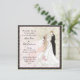 Picture of Bride in groom in an art rendering. With designed Pattern of dainty swirls, with light yellow gold and touches of pink and brown. Text in Black, with a black textured border.