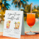 This Bride and Groom beach signature cocktails table tent sign features simple black typography above 2 drinks and their ingredients for your wedding bar. A cute Tequila Sunrise and Mai Tai drawing add a cool flair to your bar menu. Complete with the couple's names and date for their reception.