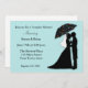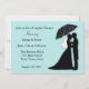 A stylish couples shower invitation with bride and groom silhouette on blue background. Bride is holding a floral umbrella.