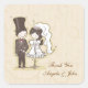 A wedding sticker with bride and groom stick couple on tan background with light swirls. Coordinating pieces available in store.