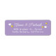 Your home address personalised in a easy way... pale purple colour label with two lines of text aligned by centre, and bride and groom names written in a stylish script font style with the image of small white and gold hearts of love.