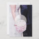 Adorable and editable wedding design with a beautiful bridal couple, holding a fresh spring flower bouquet in the background.