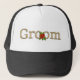 Gold lettering on black and white cap for the groom at his wedding reception