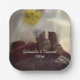 Personalise these charming Bride on Tractor Country Farm Wedding Paper Plates with the names of the bride and groom and date for use at your casual yet classy engagement barn party, bridal shower or marriage reception. These rustic chic custom western ranch theme disposable plates feature a quaint digitally enhanced farm style photograph of a cowgirl bride wearing a white wedding dress and a pair of brown leather cowboy boots carrying a bouquet of yellow daisy flower blossoms sitting on an old antique red tractor.