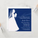 A beautiful bridal shower invitation with bride silhouette in white on navy blue background with sparkle graphic.