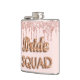 A flask for a bridal shower or bachelorette party. A light rose gold, pink background with elegant faux rose gold glitter drips, paint dripping look. With the text: Bride Squad written with a balloon style font, golden coloured.