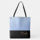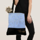 This lovely fashion forward tote bag shows the word "Bride" in a Golden-Caramel text colour over Black with the upper tote bag in Light Blue with petite Golden stars print all over. Has plenty of room for personalised text. Graphics and text are on both sides of this tote bag. Black handle. Customise further or buy as shown.